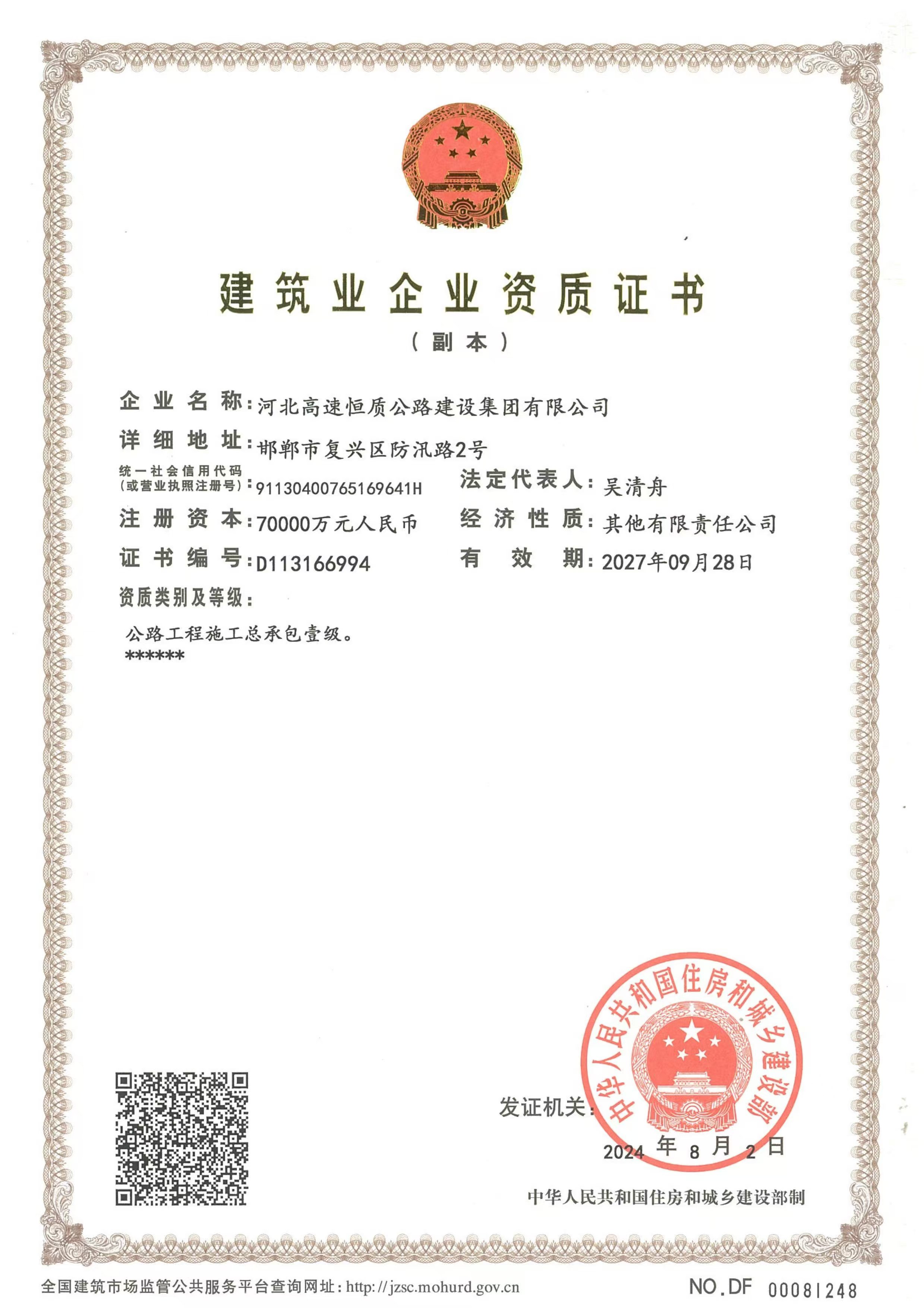 河北高速恒質(zhì)公路建設集團有限公司始建于2004年,前身是邯鄲市恒質(zhì)公路建設集團有限公司。2024年7月成為河北高速公路集團有限公司二級子公司,現(xiàn)有職工500余人,下轄18家子公司13個分公司,參股公司3家 ,注冊資本7億元,是一家集公路工程施工、路用材料研發(fā)生產(chǎn)、試驗檢測、瀝青貿(mào)易、公鐵物流于一體的多元化、綜合性單位,國家級高新技術(shù)企業(yè),河北省專精特新中小企業(yè),河北省首家瀝青拌合環(huán)保引領性企業(yè)。公司擁有公路工程總承包壹級、公路交通工程(公路安全設施)專業(yè)承包壹級、機電工程施工總承包貳級、電力工程施工總承包貳級、市政公用工程施工總承包貳級、建筑工...